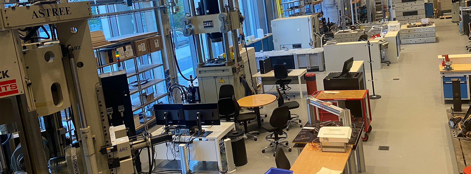 The laboratory has a number of tensile compression test facilities (2500 kN, 500 kN, 100 kN and 50 kN)